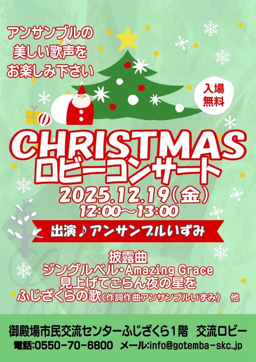 【観覧無料】ロビーコンサート開催のお知らせ!Published:2025年11月22日 クリスマスロビーコンサートを開催します! 市民交流センターロビーにて、クリスマスにちなんだ曲や、アンサンブルをぜひお聞きください♪ どなたでも無料でご参加いただけますので是非お越しください! 催事名:クリスマスロビーコンサート 開催日時:令和7年12月19日㈮ 12:00~13:00 場所:御殿場市民交流センターふじざくら 1階 交流ロビー 出演:アンサンブルいずみの皆様 詳細 Posted on 2025年11月22日2025年11月22日 by 御殿場市民交流センターふじざくら