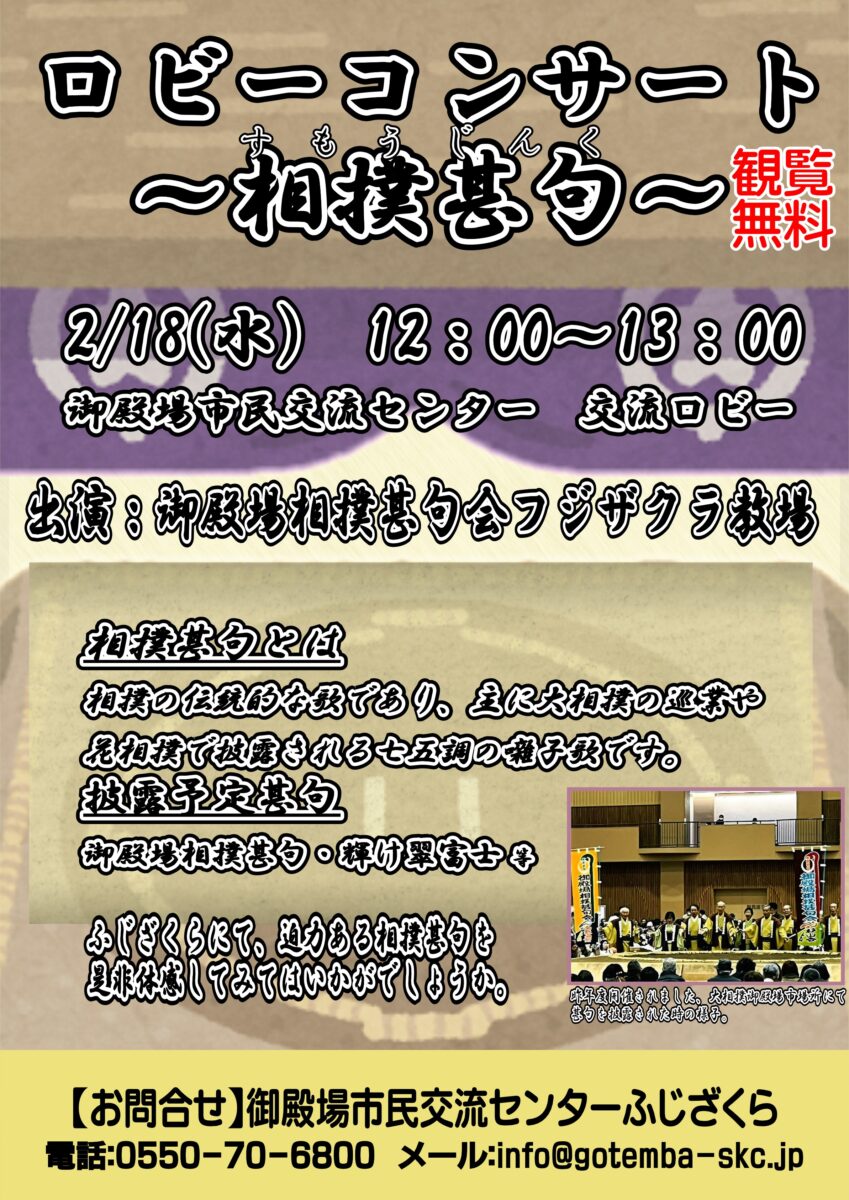 【開催決定】ロビーコンサート開催のお知らせ!【観覧無料】Published:2026年01月25日 ロビーコンサートを開催します! 市民交流センターロビーにて、迫力ある相撲甚句を体感ください♪ どなたでも無料でご参加いただけますので是非お越しください! 催事名:ロビーコンサート 開催日時:令和8年2月18日(水) 12:00~13:00 場所:御殿場市民交流センターふじざくら 1階 交流ロビー 出演:御殿場相撲甚句会フジザクラ教場の皆様 詳細 Posted on 2026年1月25日2026年1月25日 by 御殿場市民交流センターふじざくら