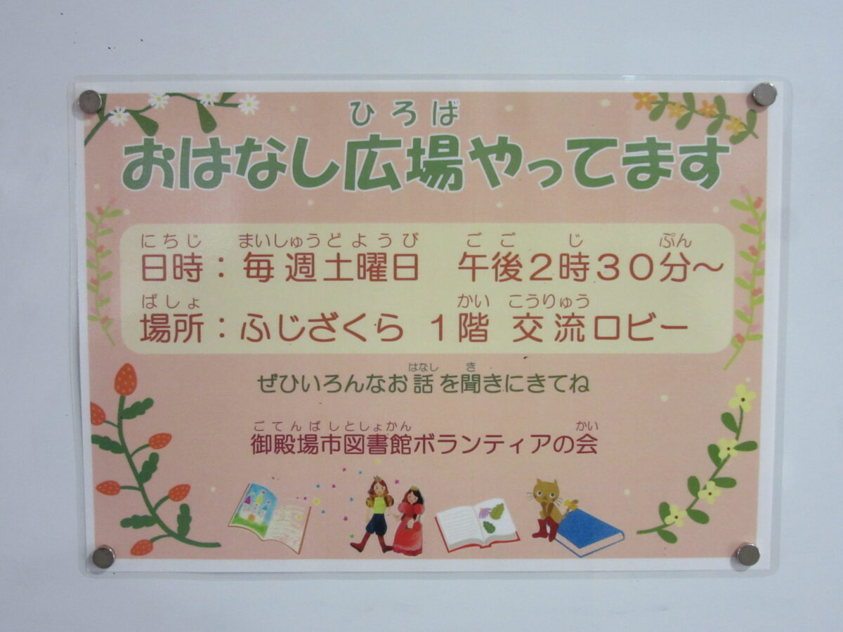 御殿場市図書館休館に伴い、御殿場市民交流センター内にて「おはなし広場」定期開催をします。