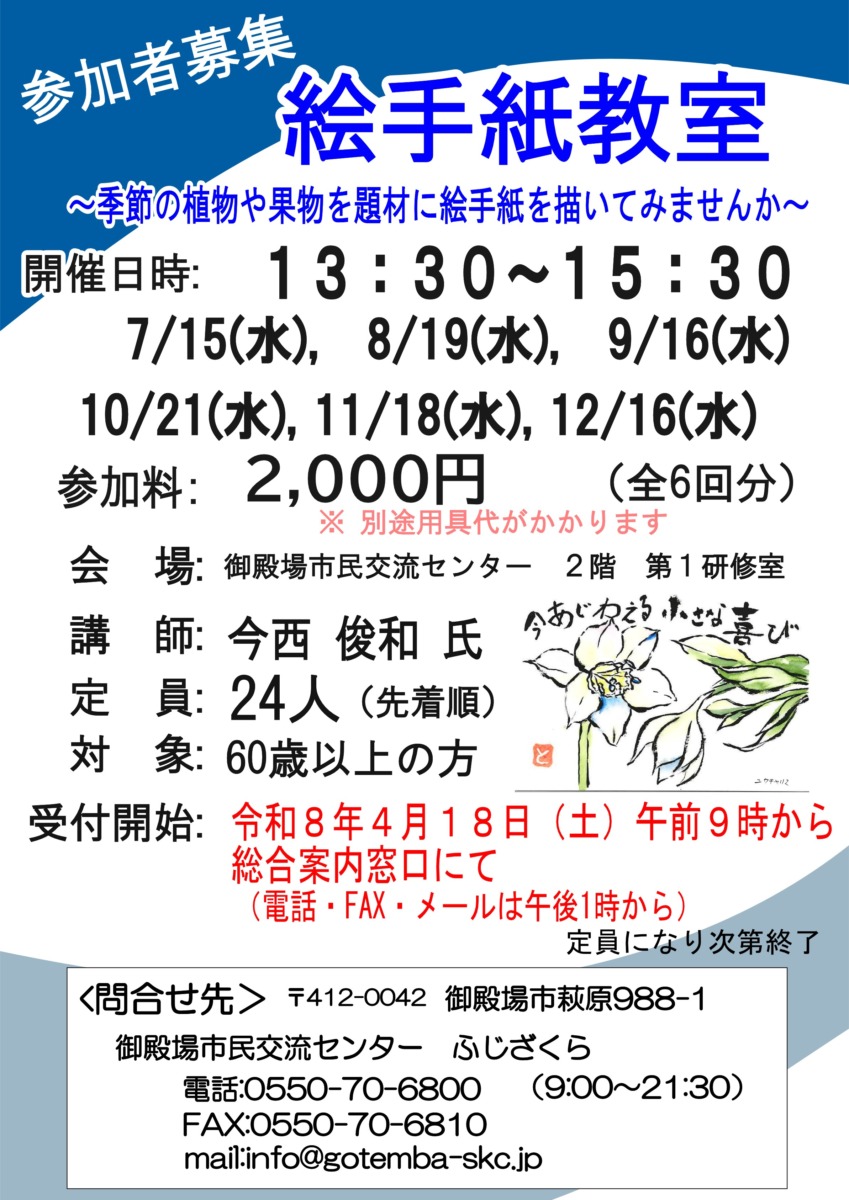 御殿場市民交流センターでは、季節の植物や果物を題材にした「絵手紙教室」を開催します。